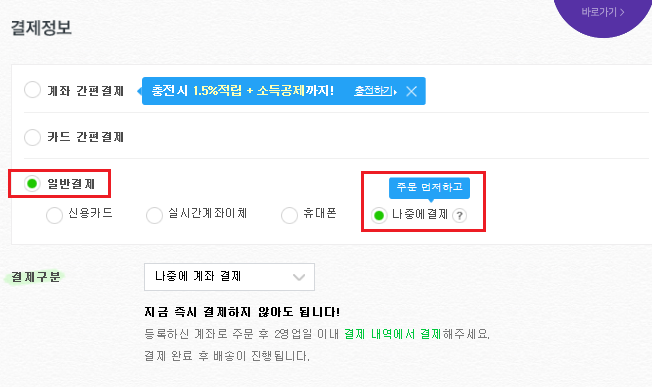 구매하기를 누른 후 결제정보에서 일반결제를 누른 후 주문 먼저 하고 나중에 결제를 체크한다. 이렇게 하면 결제 비밀번호 누를 팝업창? 도 뜨는 시간을 아낄 수 있기에 남들보다 먼저 주문을 할 수 있다.