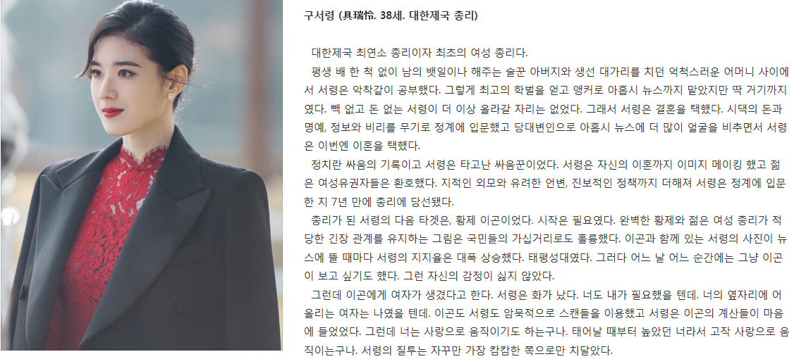 이번 더 킹 : 영원의 군주라는 드라마에서는 대한제국의 최연소 총리이자 최초의 여성 총리역할인데 이민호와 관련이 높은 인물이라 투샷이 많이 잡힐 것으로 예상된다. 드라마 중 정치인인이며 이민호를 좋아하는 역으로 소개되는데 나중엔 질투가 캄캄한 쪽으로 치달았다고 소개된 것으로 봐 드라마 비중이 꽤 많아 보인다.