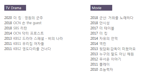 또한 다양한 드라마와 영화 활동을 했는데 대표적으로 영화 더 킹, 안시성, 역린에서는 조연으로 드라마 리턴에서는 주연으로 활동을 했다. 대표적이란 내 기준 꽤 이름을 알린 작품으로 한정했다.