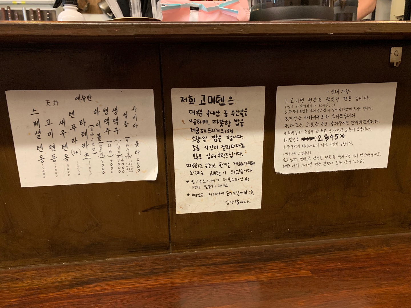 고미텐은 일렬좌석이다. 흔히 말하는 다찌식 테이블인데 쉐프라던지 음식을 주는 분들이 바로 줄 수 있는 방식이다. 또한 결제또한 바로 앉은자리에서 해주기에 편하다고 하면 편한. 하지만 요즘 같은 시기엔 너무 붙어있다보니 조금은 꺼려진다.